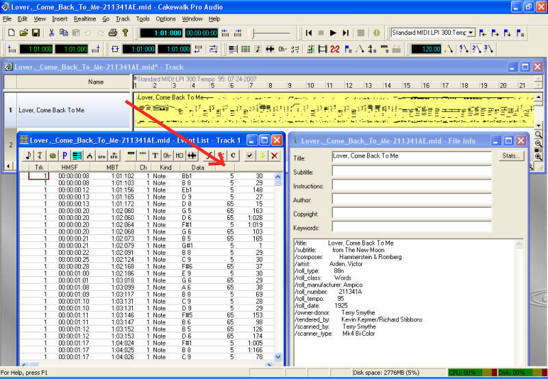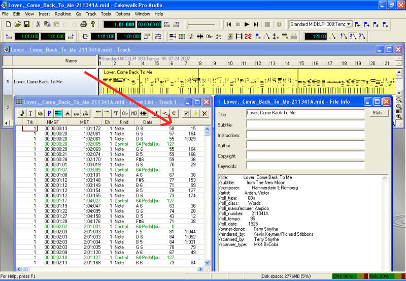 The .CIS archive file is then processed to simultaneously create both a midi type 1 file and an e-roll file. This view is of the midi type 1 file