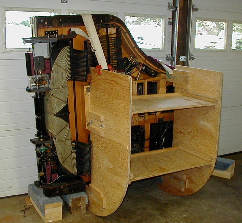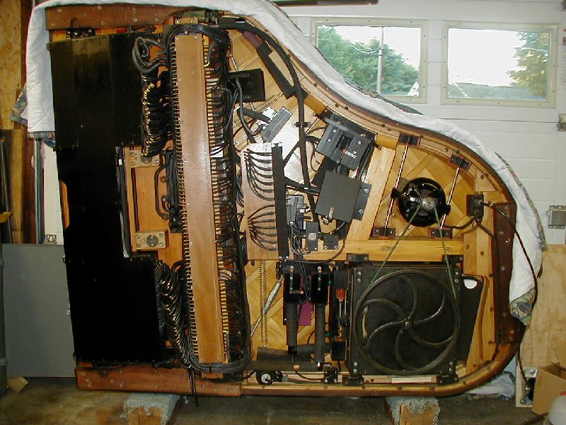 Here are a few pics of a Mason & Hamlin Ampico B grand piano, retored and equipped with e-valves by Bob Hunt. The final pic illustrates a unique one-man tilter.