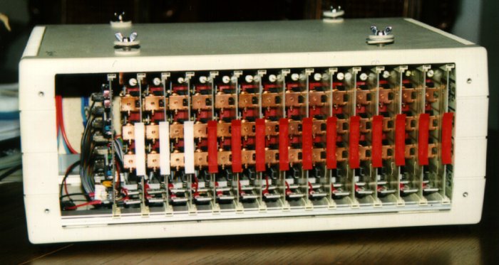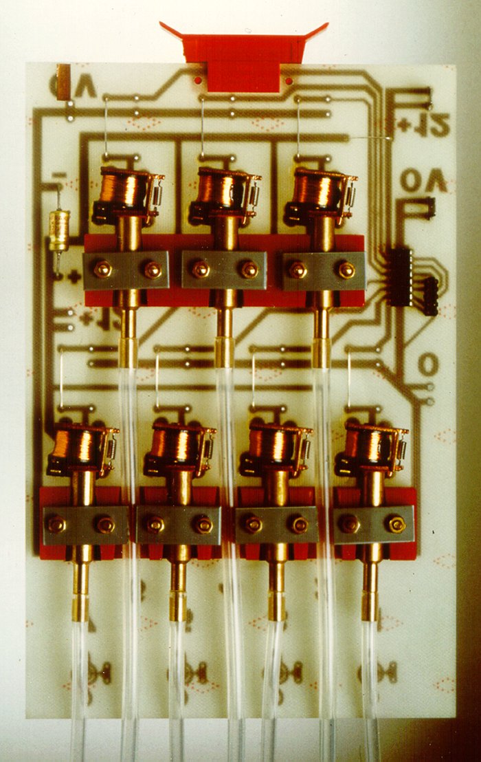 Seven of these modified relays are mounted onto a single printed circuit board which measures 220 mm by 144,5 mm. An integrated circuit with seven darlington amplifiers permits control by TTL logic levels that are routed to the board via a header connector. The power (nom. 12 Volts) comes onto the board by means of blade terminal plugs. For an Ampico piano 14 of these boards are combined in a standard 19 inch rack, which also hosts the controller board.