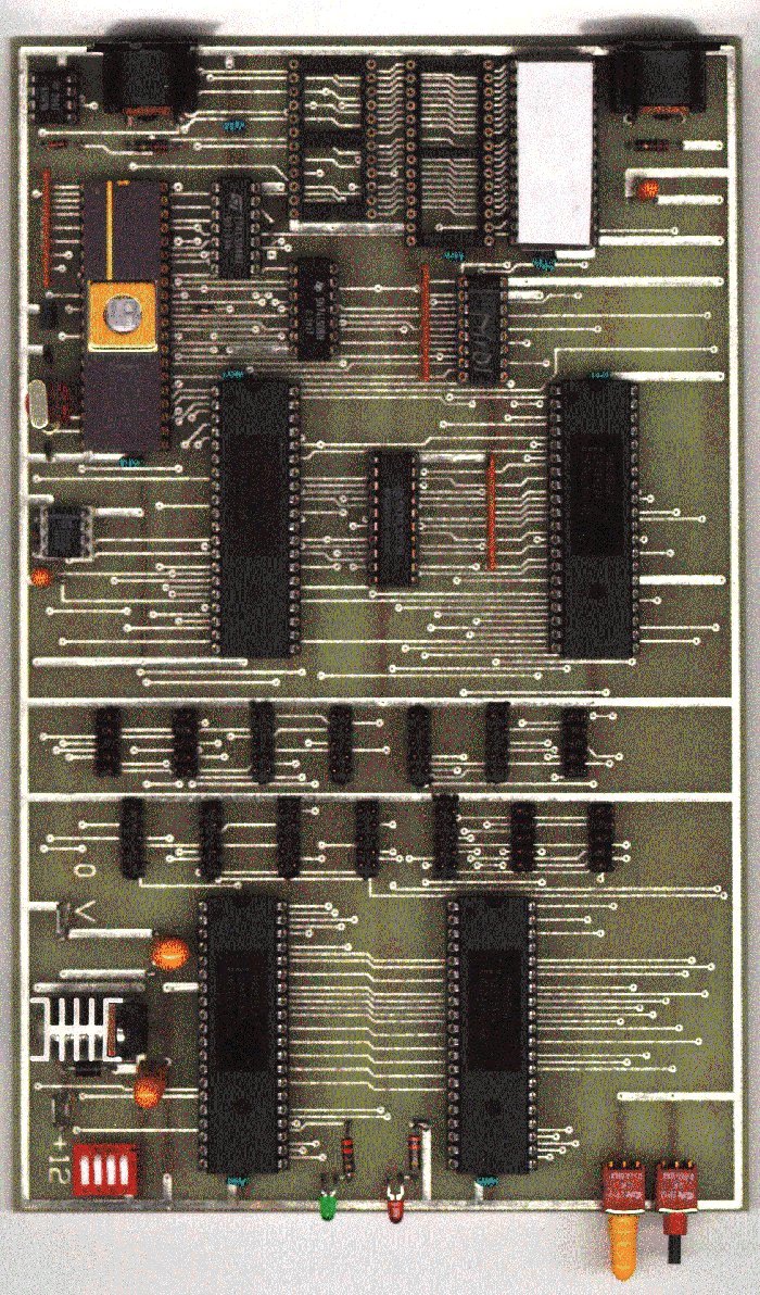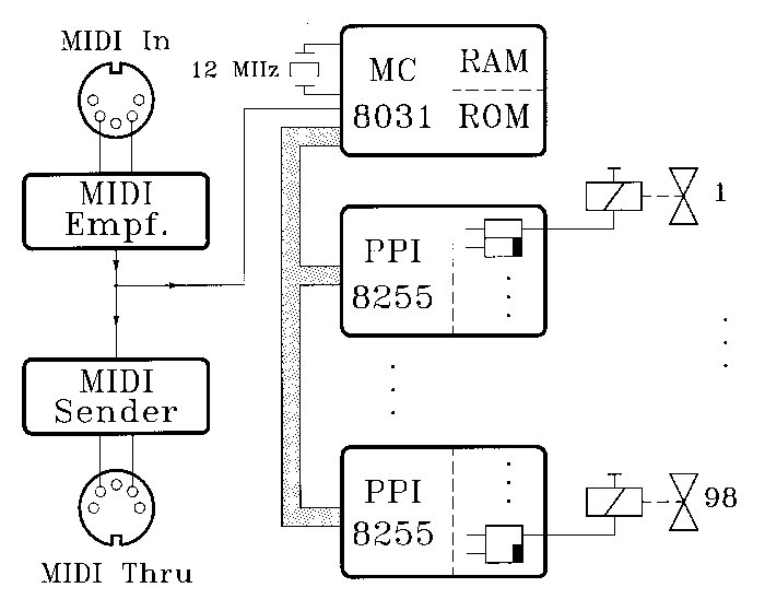 This controller is located on another printed circuit board with the same dimensions as above. The heart of this board is a standard microprocessor (micro controller) of the 8031 family. The block diagram shows the principles of operation. The micro controller receives MIDI commands over a serial line and an opt coupler. The MIDI commands are decoded and converted into commands for four peripheral port interface chips that are configured as outputs. The MIDI input to the board can be routed to additional MIDI slaves, using a MIDI Thru output.